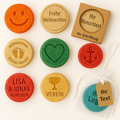 Sie können Seifen mit dem Eventlogo, speziellen Motiven oder dem Veranstaltungsnamen gestalten. So entsteht ein einzigartiges Erinnerungsstück für Teilnehmer und Gäste.